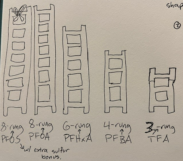 You can think about PFAS like a family of different types of ladders and ladder-like objects. The PFAS you’ve heard most about unfortunately has very similar sounding acronym, PFOS. You may also have heard about PFOA, which has the highest know toxicity. Both of these are eight-rung ladders, meaning that they have eight C’s that are all surrounded by F’s. You’ll also hear these called “C8” or “eight-carbon” PFAS.